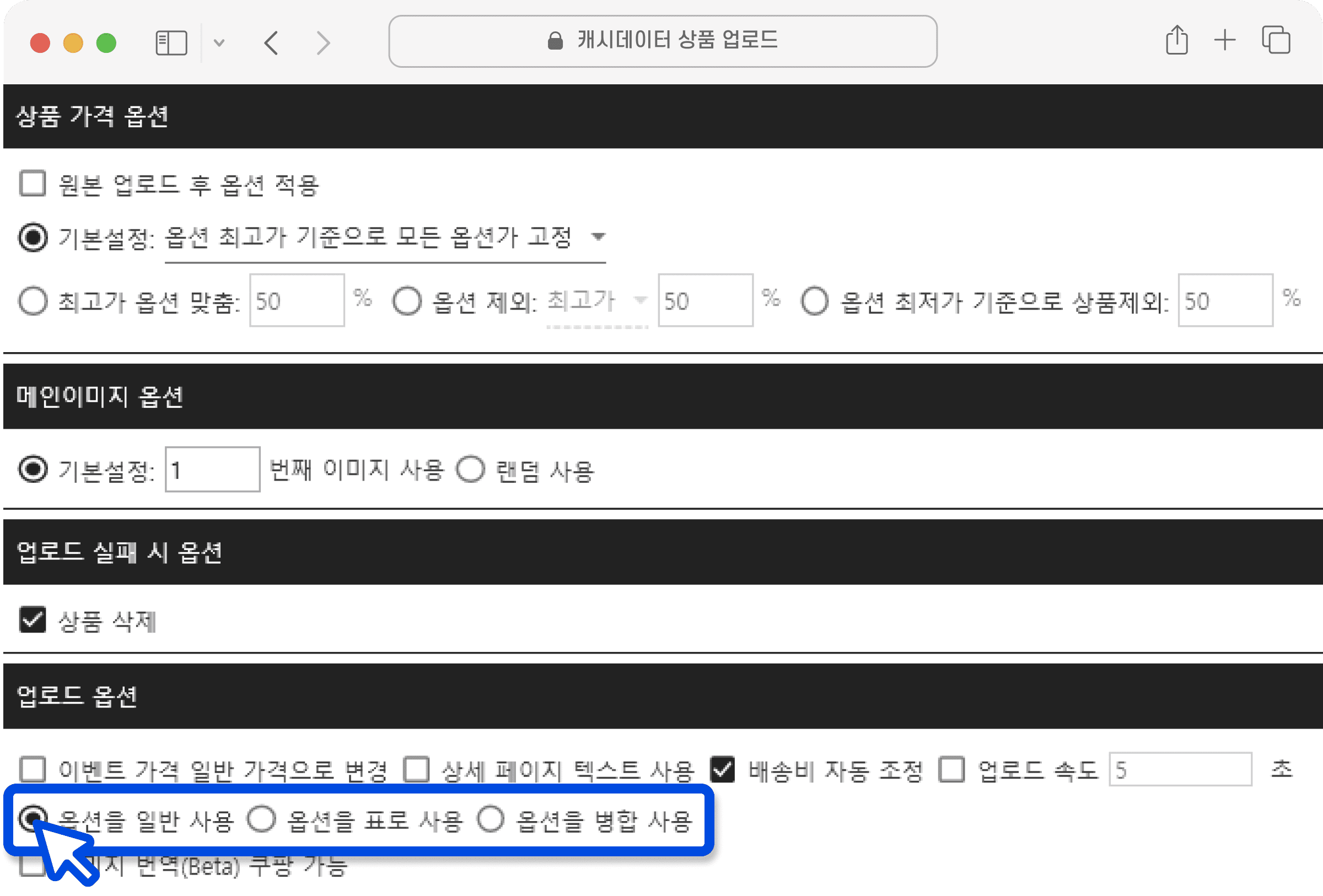 업로드 하는 상품의 상세 페이지 내옵션 형식을 설정할 수 있는 기능(일반, 표, 병합)