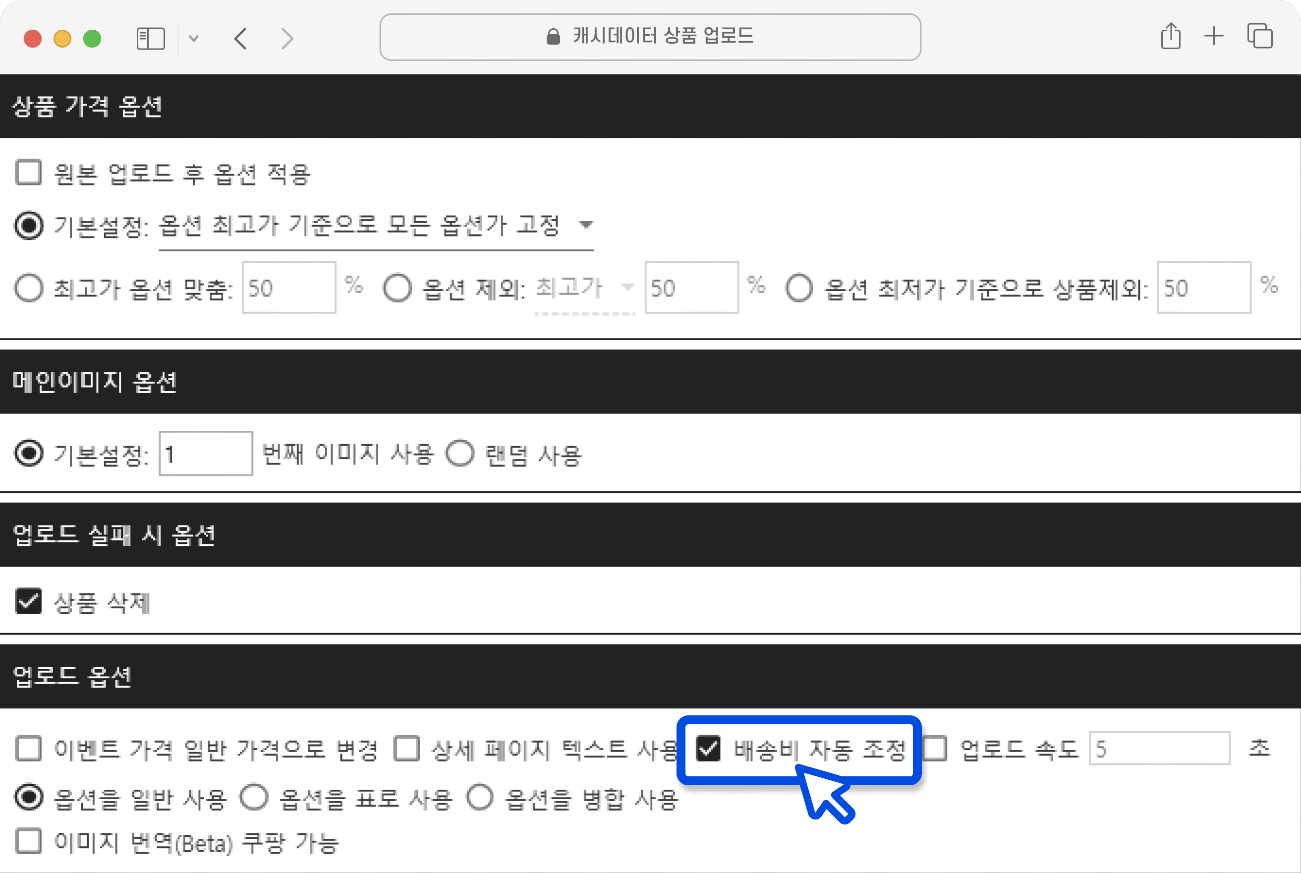 마켓별 배송비 기준 초과 시,업로드하는 오픈 마켓 배송비 기준으로 자동 조정