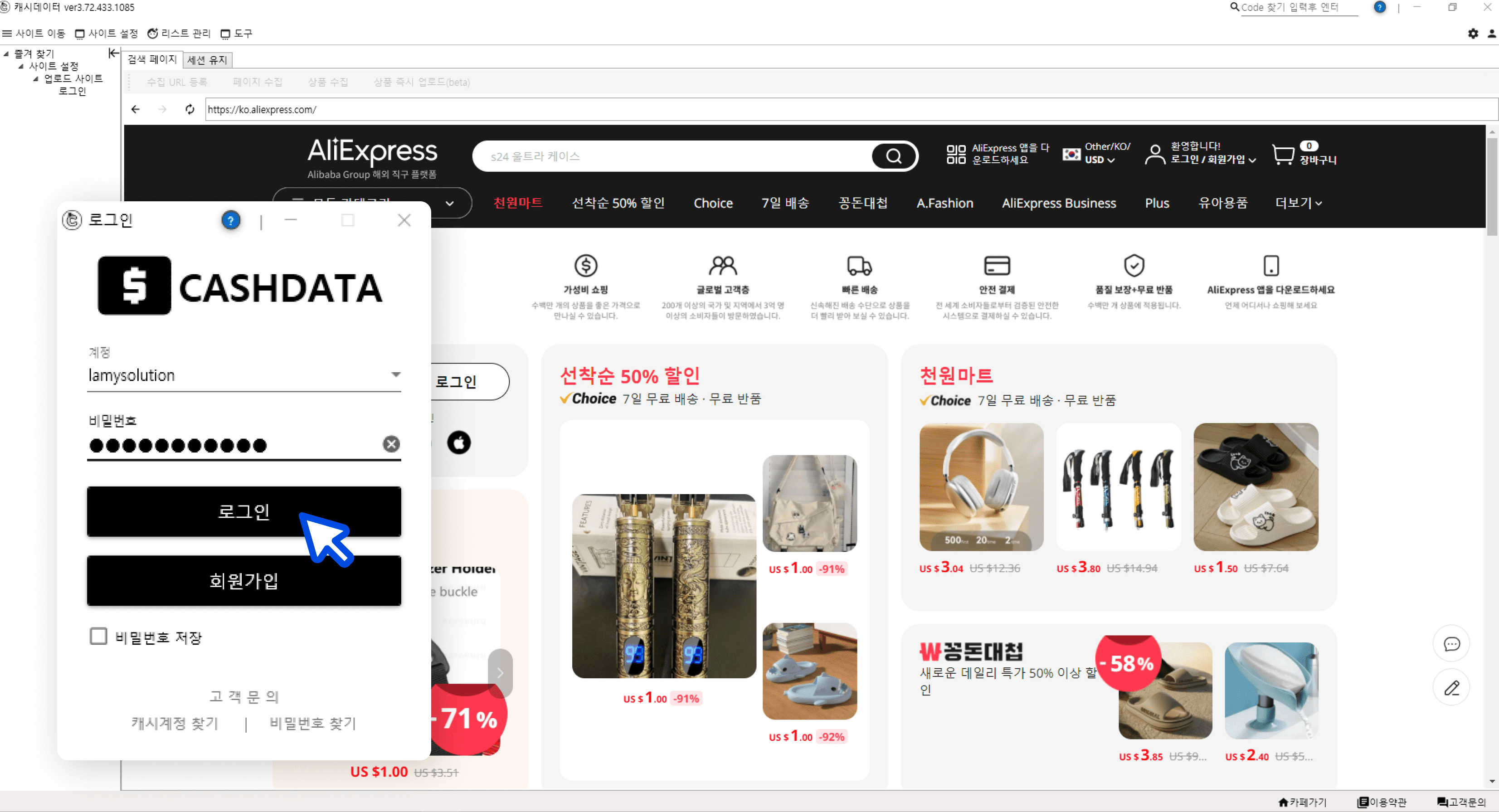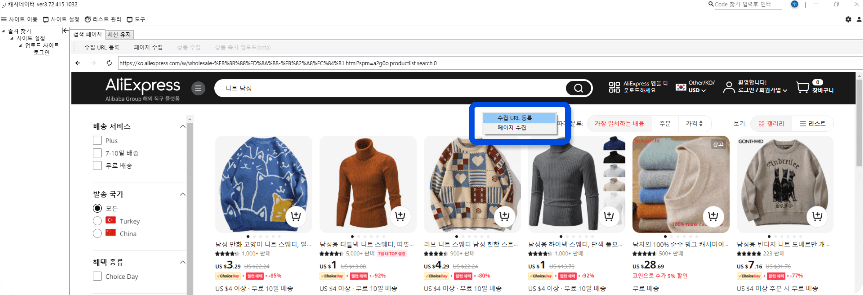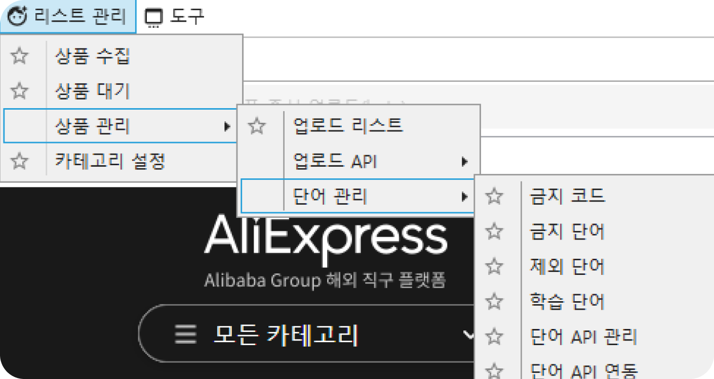 알리익스프레스, 아마존 (US 외 21개 국가), 라쿠텐, 테무에서상품을 수집, 국내 쇼핑몰에 자동으로 업로드